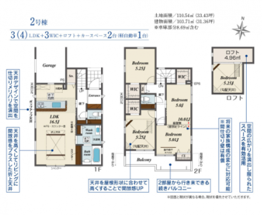 - 食器洗浄乾燥機、浴室乾燥機、ウォークインクローゼット、ロフト、トイレ2箇所、ウォシュレット付きトイレ1F・2F 間取り変更可 アクセントクロス